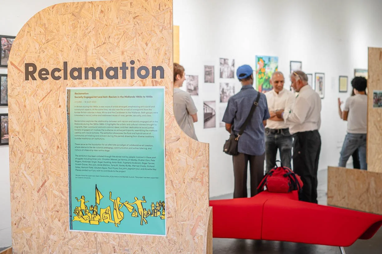 The exhibition visits the past through a non-linear historical narrative encouraging reflection on these concepts while amplifying the voices of Global Majority communities. Reclamation consists of stories on the gallery's outer walls, providing a short historical overview of the past century. In between the outer wall, there are panels which focus on specific examples in the Midlands, including the poetry readings from the Indian Workers Association, educational classes offered by the Westminster Endeavour for Liaison and Development (WELD), and the communal space created by the maiden Nottingham Mela. These serve as the foundation for an alternate paradigm of collaborative art creation, where elements like de-colonial pedagogy, communication and active listening, and notions of citizenship take centre stage.